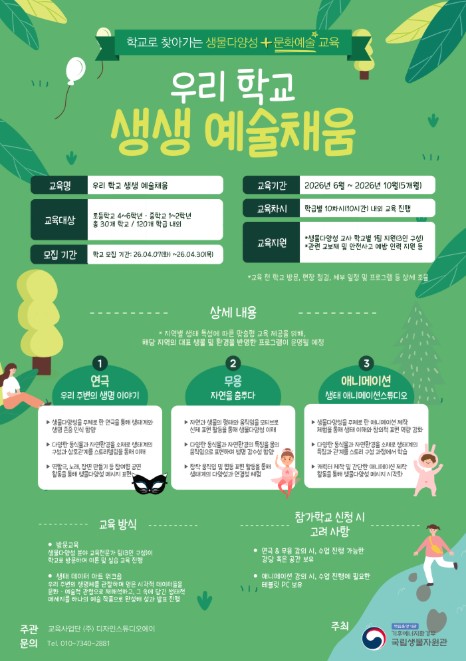 기후에너지환경부 소속 국립생물자원관(관장 유호)은 4월 7일부터 문화예술을 접목한 생물다양성 교육과정 ‘우리 학교 생생 예술채움’ 수업에 참여할 학교 30개교를 모집한다고 밝혔다. 이번 사업은 ‘202…