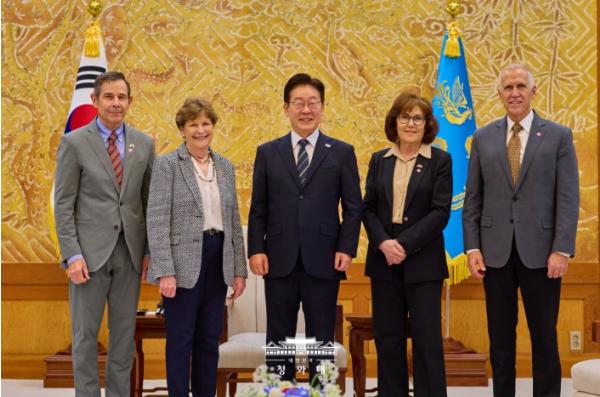 이재명 대통령은 4월 2일 오후 청와대에서 진 섀힌(Jeanne Shaheen) 상원 외교위원회 간사 등 공화·민주 양당 의원으로 구성된 미국 상원의원 대표단을 접견했다. 이 대통령과 미 대표단은 한미동맹 및 한반