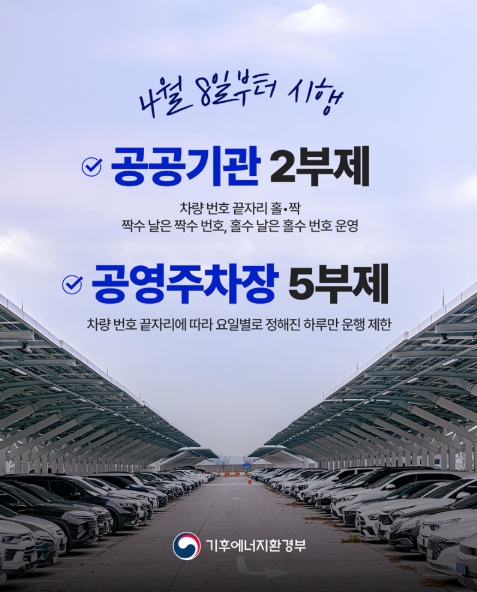 - 4월 8일부터 시행■ 공공기관 2부제차량번호 끝자리 홀·짝짝수 날은 짝수 번호, 홀수 날은 홀수 번호 운영■ 공영주차장 5부제차량번호 끝자리에 따라 요일별로 정해진 하루만 운행 제한…
