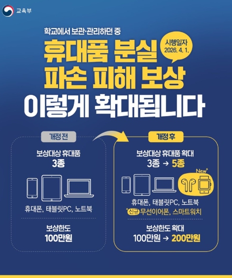 학교에서 보관·관리하던 중 휴대품 분실·파손 피해 보상 이렇게 확대됩니다.(시행일자 2026.4.1.)■ 개정 전보상대상 휴대품: 3종- 휴대폰, 태블릿PC, 노트북- 보상한도 100만 원■ 개정 후보상대상 휴대…