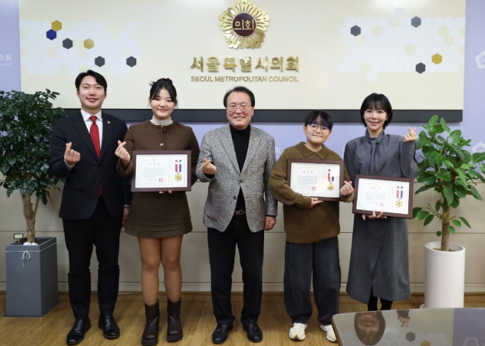 26일 서울특별시의회 김규남 의원(국민의힘, 송파1)의 주관으로 서울시의회 본관에서 전 아나운서이자 통·번역가인 이윤진 씨와 그의 자녀 이소을 양, 이다을 군에 대한 서울특별시의회 의장 표창 수여식이…
