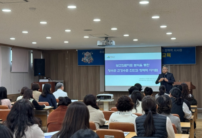 장수군은 보건의료원 4층 대회의실에서 보건의료 정책 수립 역량 강화를 위해 보건의료원 직원을 대상으로 ‘보건의료지표 분석을 통한 장수군 건강수준 진단과 정책적 시사점’을 주제로 한 역량강화 교육…