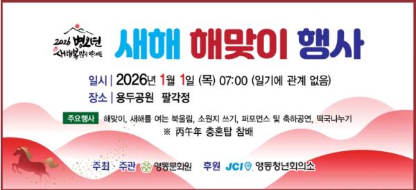 영동문화원은 내년 1월 1일 오전 7시, 용두공원 팔각정 앞에서 군민의 소망 성취와 지역의 번영을 기원하는 ‘2026 신년 해맞이 행사’를 개최할 예정이다.이번 행사는 영동문화원이 주최·주관하며, 600여