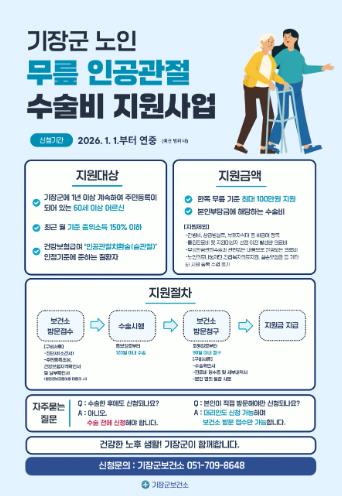 기장군은 오는 2026년부터 부산시 최초로 ‘어르신 무릎인공관절 수술비 지원사업’을 확대 시행한다고 23일 밝혔다. 군은 기존 국가 지원사업으로 기초생활수급자 및 차상위계층 등에 한정됐던 지원 범위를…