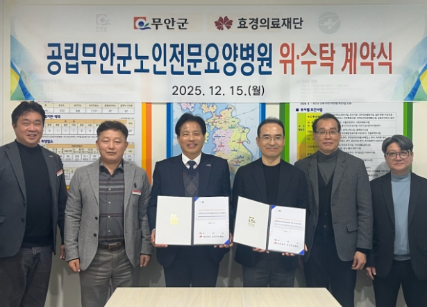 전남 무안군은 15일 의료법인 효경의료재단과 공립무안군노인전문요양병원의 민간 위·수탁 운영 계약을 체결했다.이날 계약에 따라 효경의료재단은 2026년 1월 20일부터 2031년까지 5년간 공립무안군노인전…