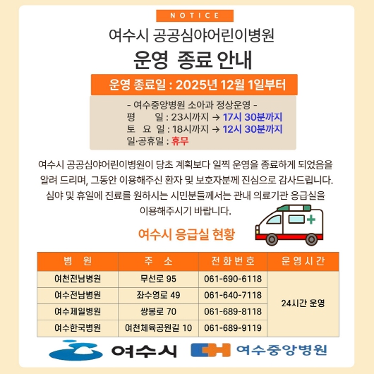 여수시는 여수중앙병원이 운영 중인 ‘여수시 공공심야어린이병원’이 병원 내부 사정으로 인해 당초 계획보다 앞당겨 2025년 12월 1일부터 운영을 종료한다고 밝혔다.여수시 공공심야어린이병원은 야간·심…