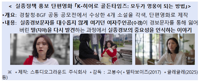 경찰청에서는 11월 24일 15시, 실종아동등의 조속한 발견을 위해 추진하는 실종경보제도 홍보를 위한 ‘실종경보 홍보영상 상영회’를 개최한다. 이날 상영되는 홍보영상은 ▵경찰청-현대해상 공동 실종경보…
