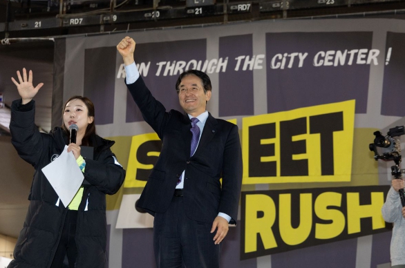 이동환 고양특례시장이 지난 15일 열린 ‘2025 고양 스트릿 러쉬 in 라페스타’에서 “불빛과 사람이 가득한 도심 속을 시원하게 질주하며 열정 가득한 순간을 만끽하길 바란다”고 말하고, 선수들의 레이스…