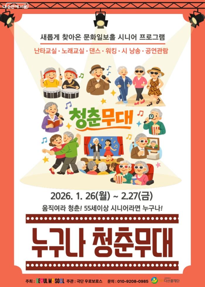서울시가 기존 어르신 전용 영화관인 ‘청춘극장’(중구 문화일보홀)을 참여형 문화공간으로 개편해 ‘누구나 청춘무대’라는 이름으로 시범 운영에 들어갔다. 이번 변화는 단순 관람 중심에서 벗어나, 어르신들이 직접 참여하고 교류할 수 있는 문화쉼터로 기능을 확장하는 데 목적을 두고 있다.