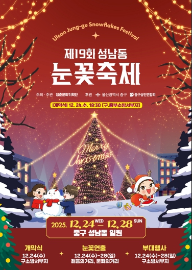 지역 대표 겨울 축제, ‘제19회 성남동 눈꽃축제’가 오는 12월 24일부터 12월 28일까지 닷새 동안 성남동 젊음의거리와 문화의거리 일원에서 열린다.이번 축제는 청춘문화기획단이 주최·주관하고, 울산 중…