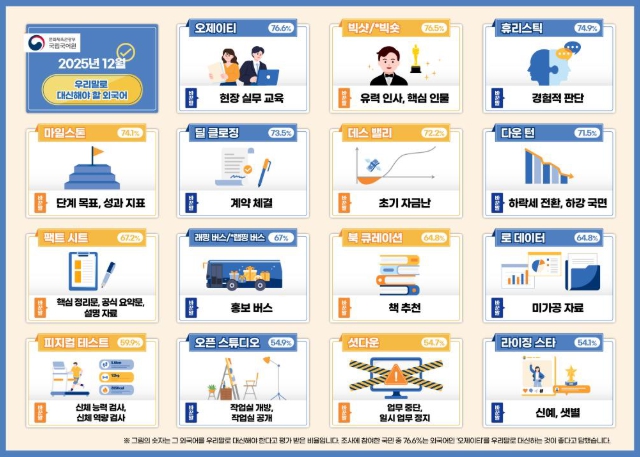 문화체육관광부와 국립국어원은 언론, 일상 생활 등 사회 전반에서 사용되는 외래 용어 가운데 15건을 쉬운 말로 다듬고, 콘텐츠 분야에서 쓰이는 전문용어 62개의 쉽고 바른 표준안을 마련했다. 이번에 선…