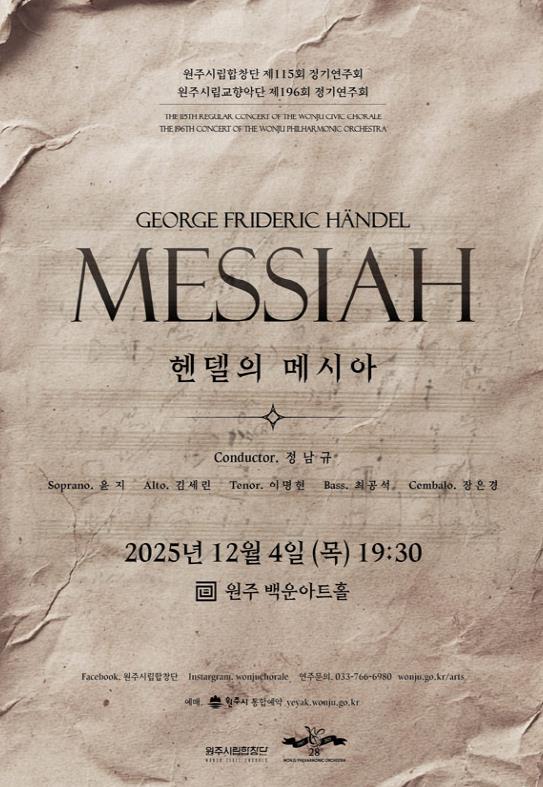 원주 시립합창단과 시립교향악단은 오는 12월 4일 오후 7시 30분 백운아트홀에서 정기연주회 ‘헨델의 메시아’를 개최한다.이번 정기연주회에서는 시립합창단 정남규 상임지휘자의 지휘 아래, 시립합창단과…
