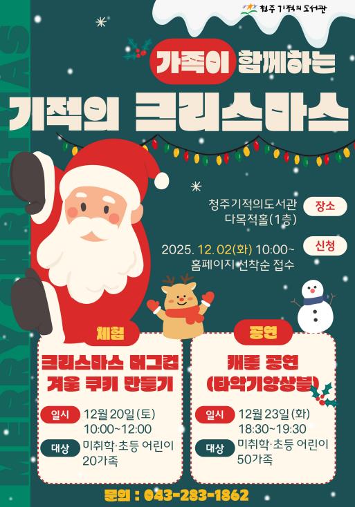 청주기적의도서관은 오는 12월 20일과 23일 청주기적의도서관 다목적홀(1층)에서 ‘가족이 함께하는 기적의 크리스마스’ 행사를 개최한다.올해 행사는 크리스마스 시즌을 맞이해 가족이 함께 즐길 수 있는 …
