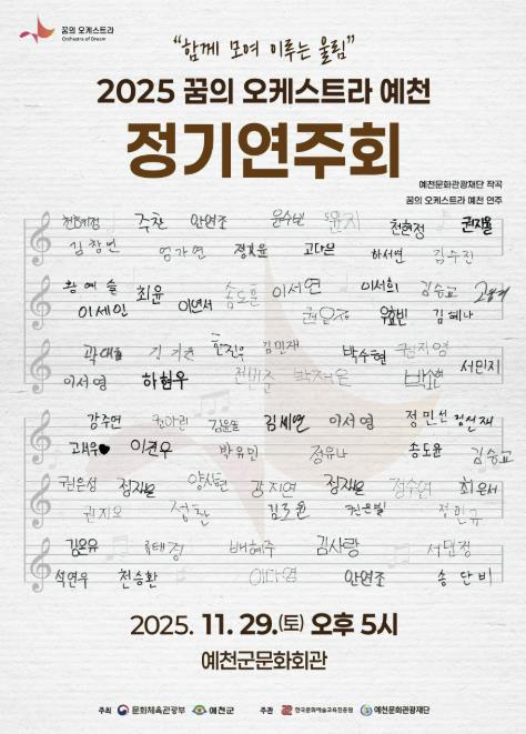 예천문화관광재단은 오는 29일 오후 5시, 예천군문화회관에서 '2025 꿈의 오케스트라 ‘예천’ 정기연주회 '함께 모여 이루는 울림''을 개최한다.‘꿈의 오케스트라 예천’은 문화체육관광부와 예천군이 주…