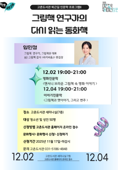 김포시 고촌도서관이 오는 12월 2일, 12월 4일 오후 7시부터 9시까지, 2회에 걸쳐 야간 퇴근길 인문학 강의Ⅱ를 운영한다. 이번 강의는 그림책 연구가이자 그림책큐 대표인 임민정 연구가가 진행하는 강의로…