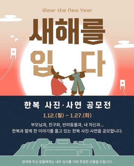 부모님과, 친구와, 반려동물과, 내 자신과…한복과 함께 한 이야기를 품고 있는 한복 사진·사연을 공모합니다.참여해 주신 분들에게는 내부 심사를 거쳐 푸짐한 선물을 드립니다.■ '새해를 입다' 한복 사…