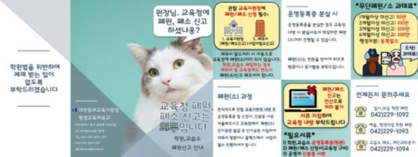 대전동·서부교육지원청은 관내 세무서와 협조하여 세무서 민원실에 학원·교습소 폐원 및 폐소 안내 리플릿을 비치한다고 밝혔다.이번 안내 리플릿은 폐업으로 인한 사업자 말소 신청을 위해 세무서를 방문한