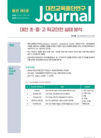 대전교육과학연구원 대전교육정책연구소는 2025년 대전교육종단연구저널 제5호'대전 초·중·고 학교안전 실태 분석', 제6호 '대전 교육가족의 정신건강 현황 분석'을 발간하여 대전 모든 기관 및 전국 교육정