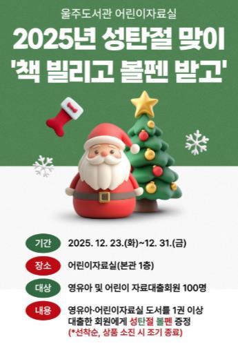울산 울주도서관이 한 해를 마무리하는 12월을 맞아 어린이들을 위한 독서 행사와 지역 예술 동아리의 작품 전시회 등 다채로운 연말 프로그램을 운영한다. 먼저 어린이들의 독서 의욕을 높이고자 특별 행