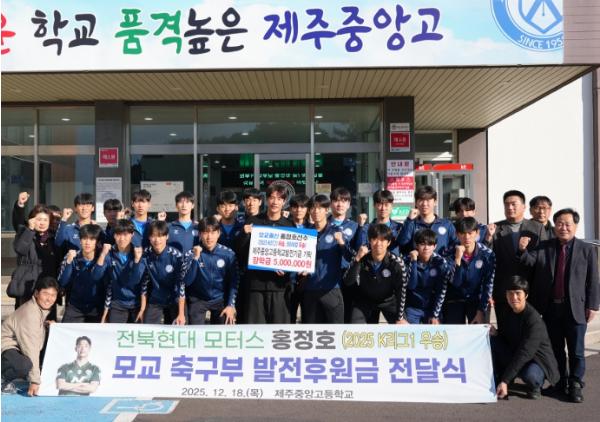 제주도교육청 제주중앙고등학교는 18일 본교 출신인 프로축구 홍정호 선수(전북 현대 모터스)가 모교를 방문하여 학교 발전 기금 500만 원을 기탁했다고 밝혔다. 홍정호 선수는 후배들의 교육 환경 개선과