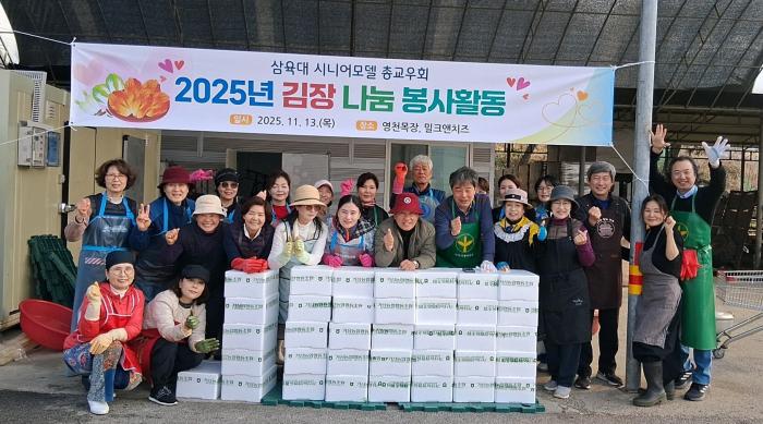 삼육대학교 시니어모델 최고위과정 총교우회(회장 최청수)가 늦가을의 정취 속에서 지역사회 소외계층을 위한 뜻깊은 나눔의 장을 마련했다. 11월 13일 오전, 포천시 가산면 정금로 소재 영천목장과 밀크앤치즈(대표 이은미·시니어모델 어드밴스드과정) 작업장에서 열린 ‘2025년 사랑의 김장 나눔 봉사활동’은 교우들의 정성과 헌신이 빛난 자리였다.