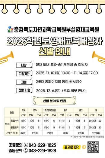 충청북도교육청 직속기관 자연과학교육원은 2026학년도 자연과학교육원부설영재교육원 영재교육대상자 선발을 실시한다고 밝혔다. 융합수학, 융합과학 2개 분야를 모집하며, 2026학년도 기준 초등학교 4학년
