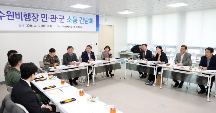 수원특례시의회는 19일 의회 세미나실에서 공항 소음피해지역 주민들과 군, 시 관계자가 함께하는 ‘민·관·군 소통 간담회’를 개최하고 소음피해 해소를 위한 실질적인 대응 방안 마련에 나섰다.이번 간…
