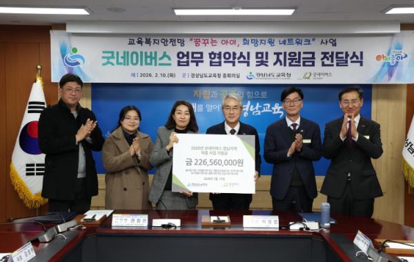 경상남도교육청은 10일 본청 중회의실에서 굿네이버스 경남사업본부와 업무 협약을 맺고 지원금 전달식을 열었다. 이번 행사는 교육복지안전망인 ‘꿈꾸는 아이, 희망지원 네트워크’ 사업의 하나로 마련했
