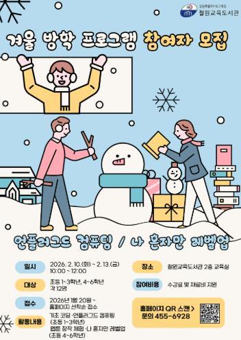 철원교육도서관은 2026년 겨울방학을 맞아 초등학생을 대상으로 디지털 창의 교육 프로그램을 운영한다. 이번 겨울방학 프로그램은 기초 코딩과 웹툰 창작 활동을 통해 초등학생이 디지털 기초 개념을 이해