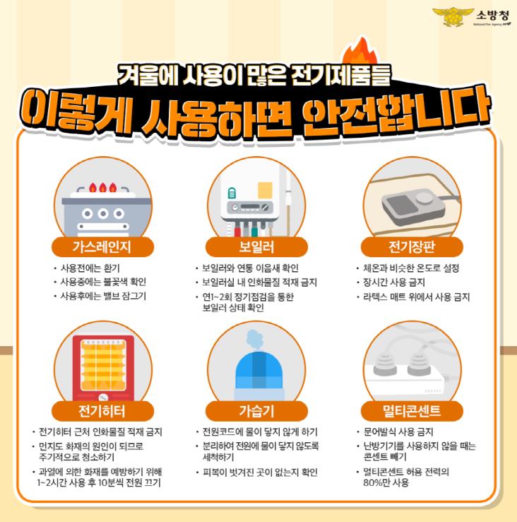 광명소방서는 이번 사례를 계기로 전기매트와 전기히터 등 난방기기 사용 시 반드시 지켜야 할 안전수칙을 강조했다. 주요 수칙으로는 ▲KC 인증 제품 사용 ▲라텍스 제품과 병행 사용 금지 ▲외출 시 전원 차단 ▲전원 코드 상태 점검 등이 있으며, 화재 징후가 발견될 경우 즉시 사용을 중단하고 119에 신고해야 한다고 당부했다.