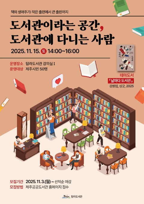 제주시 탐라도서관은 11월 15일 오후 2시 도서관 강의실Ⅰ에서 ‘도서관이라는 공간, 도서관에 다니는 사람’을 주제로 북토리 강연을 개최한다.