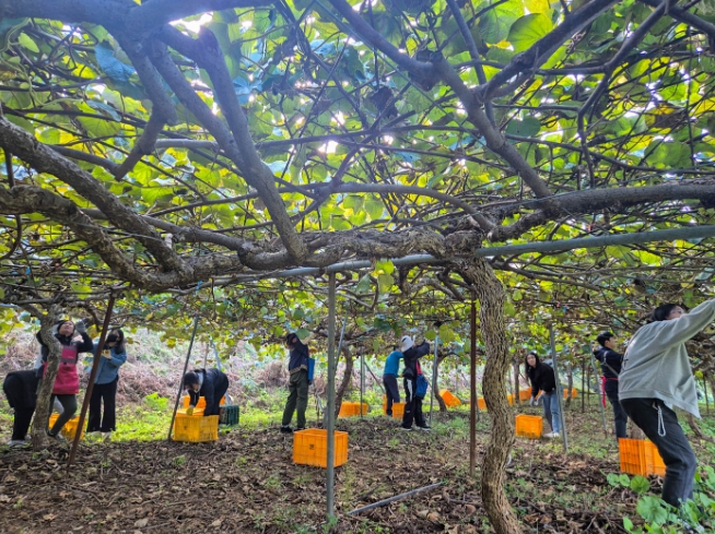 이날 오후 1시 30분부터 5시 30분까지 참다래 수확과 운반, 주변 환경 정비 등 다양한 작업에 참여하며 구슬땀을 흘렸다.
