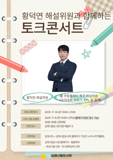 김제시립도서관은 오는 14일 금요일 19시부터 도서관 5층 배움터 3에서 ‘황덕연 해설위원과 함께하는 토크콘서트 내 꿈을 읽는 도서관’을 진행한다고 밝혔다