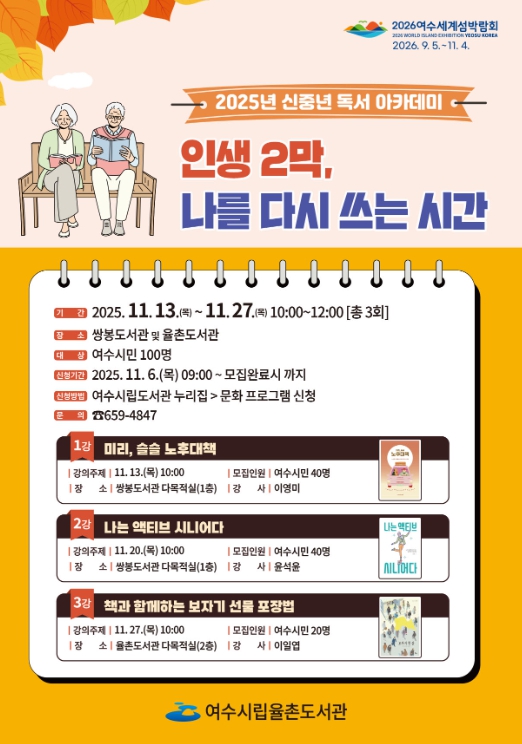 여수시는 생애전환기를 맞이하는 중장년층을 위해 ‘2025년 신중년 독서 아카데미’를 오는 11월 13일부터 27일까지 매주 목요일 오전 10시에 운영한다.