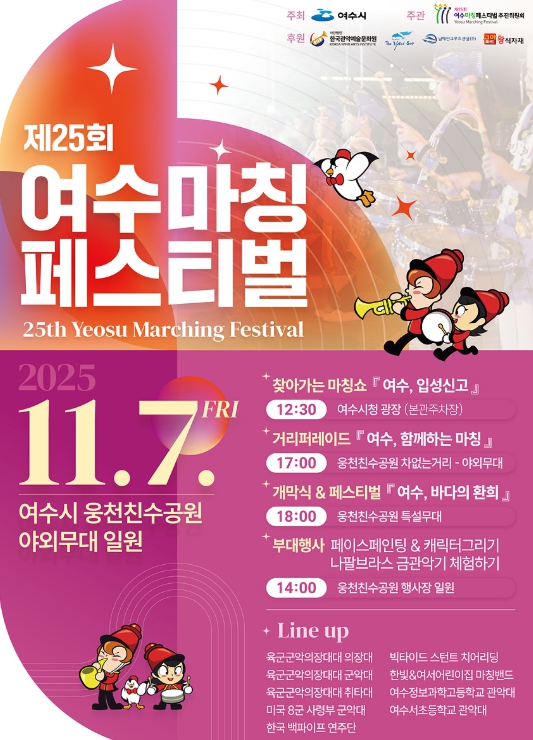여수시는 오는 11월 7일 오후 6시 웅천친수공원에서 대한민국 3대 관악제 중 하나인 ‘여수마칭페스티벌’을 개최한다.