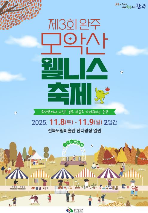 완주군은 오는 11월 8일부터 9일까지 전북도립미술관 야외광장 일원에서 웰빙, 건강, 행복을 주제로 ‘제3회 완주 모악산 웰니스 축제’를 개최한다.