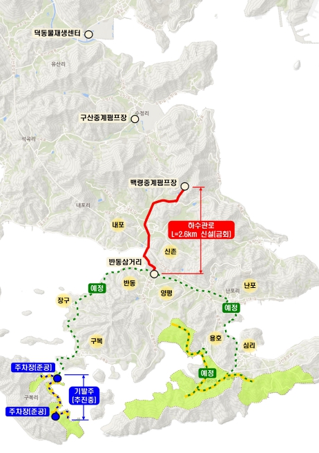 창원특례시는 금회 사업비 36억 원으로 구산면 심리 일원에 하수관로(L=2.6km) 설치하여 관광단지 및 인근 마을에서 발생하는 오수를 덕동물재생센터에서 처리하도록 하는 구산해양관광단지 공공기반시설(하수도) 설치사업을 추진할 계획이다.