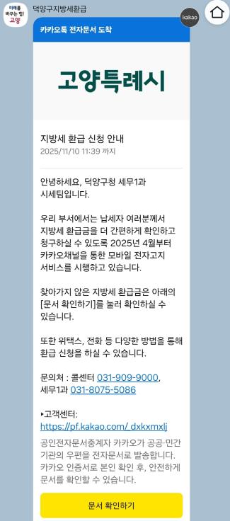 덕양구의 2025년 하반기 미환급금 정리 대상은 총 6,858건, 2억 3,736만 원이다. 구는 납세자의 권리보호를 위해 카카오 알림톡을 활용한 ‘지방세 환급 안내’를 발송하고, 대상자가 사망한 경우 주된 상속인에게 별도로 안내문을 발송할 계획이다.