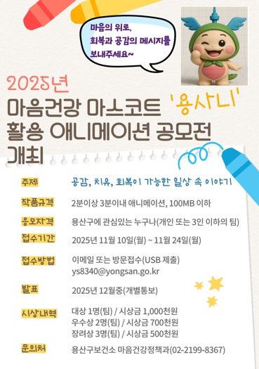 공모 주제는 ‘공감, 치유, 회복이 가능한 일상 속 이야기’로, 작품 형식은 2분 이상 3분 이내의 애니메이션(100MB 이하)이어야 한다. 용산구에 관심 있는 누구나 개인 또는 단체 단위로 참여할 수 있다.