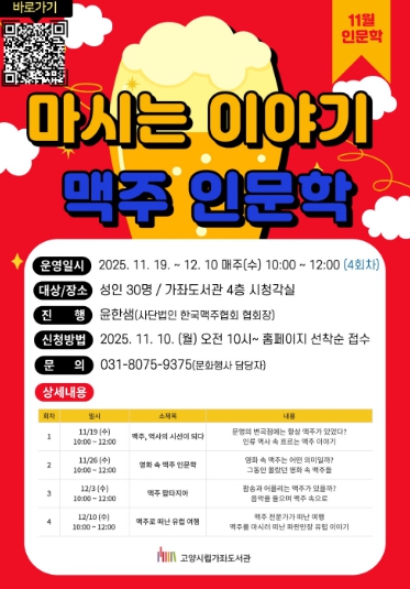 고양특례시 가좌도서관은 11월 19일부터 12월 10일까지 맥주를 키워드로 한 인문학 프로그램 ‘마시는 이야기, 맥주 인문학’을 운영한다.