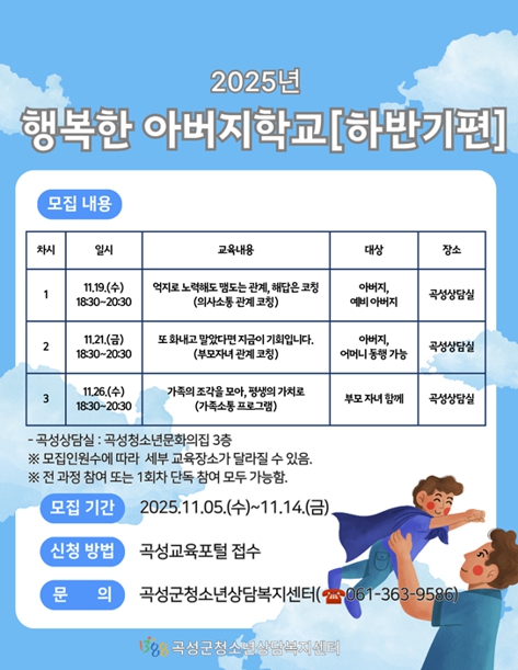 곡성군청소년상담복지센터가 지역 사회 아버지들(지역 청년회 등)의 요구 분석을 통해 가족 내 소통 역량 증진을 위한 부모교육 프로그램 ‘행복한 아버지학교’ 제10기 참가자를 모집한다고 10일 밝혔다.