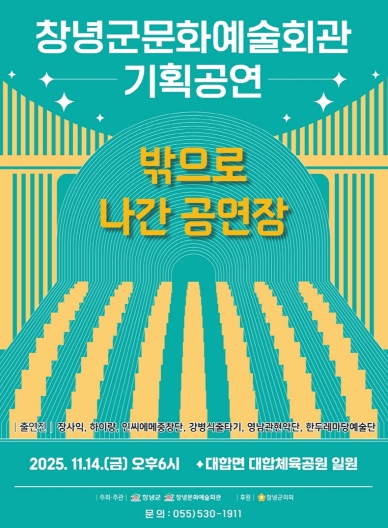 창녕군은 오는 14일 오후 6시부터 7시 30분까지 특별 기획 공연‘밖으로 나간 공연장’을 대합면 체육공원 일원에서 개최한다.
