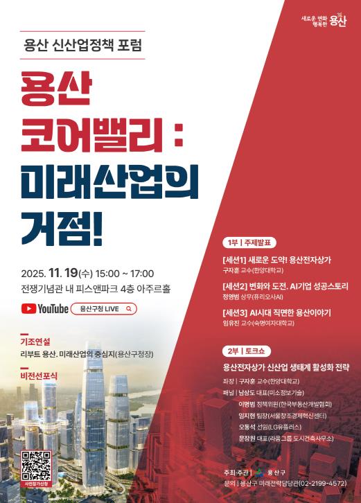 서울 용산구가 AI(인공지능)·ICT(정보통신기술) 산업 중심지로의 도약을 선언했다. 구는 오는 11월 19일 전쟁기념관 피스앤파크 아주르홀에서 ‘용산 코어밸리, 미래산업의 거점’을 주제로 ‘용산 신산업정책 포럼’을 연다고 11일 밝혔다.
