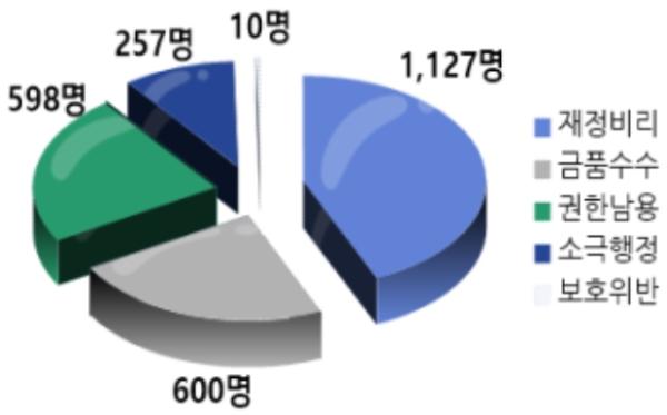 분야별 상세 단속 인원 현황을 살펴보면 ①공직비리 분야는 △재정비리 1,127명(송치 193) △금품수수 600명(송치 205) △권한남용 598명(송치 78) △소극행정 257명(송치 6) △제보자보호위반 10명(송치 3) 순으로, ②불공정비리 분야는 △불법 리베이트 516명(송치 259) △채용비리 154명(송치 33) △불법투기 2명 순으로, ③안전비리 분야는 △부실시공 551명(송치 457) △안전담합 25명(송치 19) 순으로 단속 인원이 많은 것으로 확인됐다.