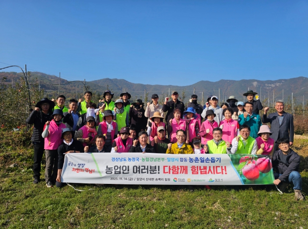 이날 일손돕기에는 김명주 경남도 경제부지사를 비롯해 정영철 경남농협 부본부장 등 경남도 농정국, 경남농협, ‘고.주.모’, 밀양시 공무원 등 60여 명이 참여했다.