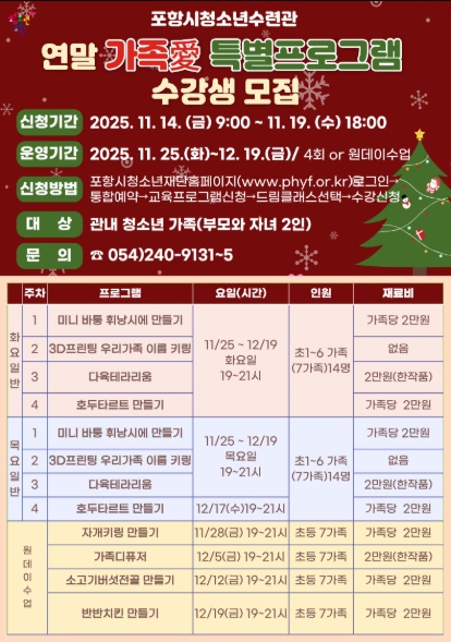 포항시청소년재단 청소년수련관은 오는 11월 14일부터 ‘연말 가족愛 특별 프로그램’ 참가자를 모집한다.