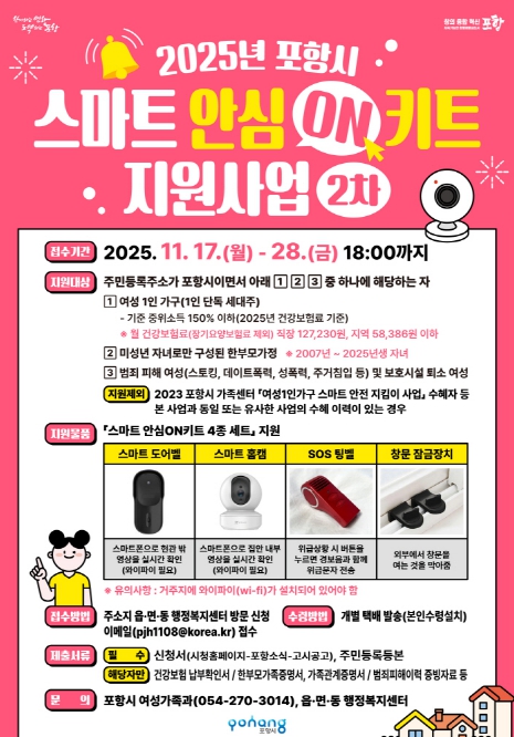 포항시는 여성 1인가구와 한부모가정 등 주거 취약계층의 안전한 생활환경 조성을 위해 ‘2025년 스마트 안심ON키트 지원사업’ 2차 대상자를 추가 모집한다.