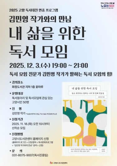 고양특례시는 오는 12월 3일 오후 7시, 화정도서관 지하 1층 꽃마루에서 독서모임 분야 전문가인 김민영 작가를 초청해 ‘김민영 작가와의 만남: 내 삶을 위한 독서 모임’프로그램을 운영한다고 밝혔다.
