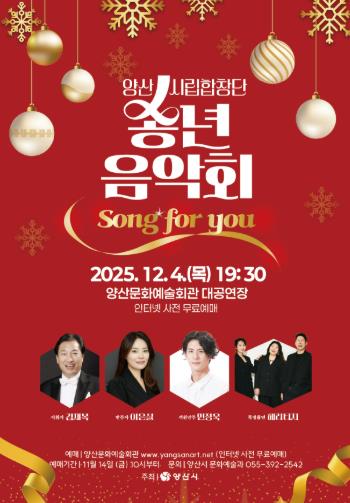 나동연 양산시장은 “양산시립합창단의 송년음악회는 매년 시민 여러분께 사랑받고 있는 특별한 행사인 만큼 이번 음악회를 통해 한 해를 잘 마무리하고 새로운 시작을 함께 준비할 수 있기를 바란다”며 “모두가 함께하는 이 자리가 양산 시민의 마음을 한데 모으고, 희망을 나누는 시간이 되기를 기대한다”고 전했다.