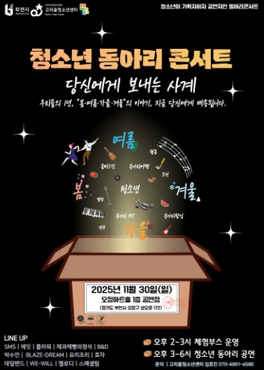 부천여성청소년재단이 운영하는 고리울청소년센터는 2025년 11월 30일, 부천시 고강동 소재 오정아트홀 1층 공연장에서 지역 청소년들이 직접 기획하고 무대에 오르는 특별한 공연, ‘청소년 동아리 콘서트 – 당신에게 보내는 사계’가 열린다.